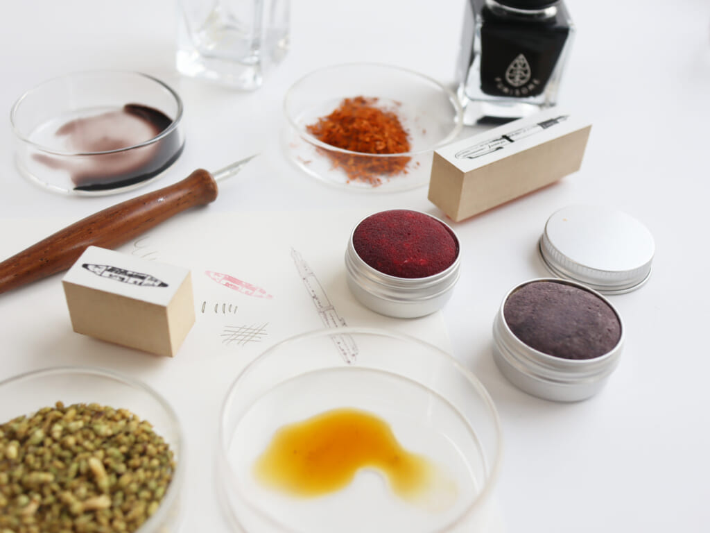 植物から抽出した天然染料と金属を組み合わせてインクを作ります。